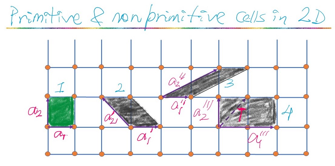 Primitive and non-primitive cells in 2-D. All pair of vectors of each cell shown are translation vectors of the given lattice. But vectors of cell 4 are not primitive translation vectors. Hence cell 4 is not primitive cell. Its because lattice translation vector T can’t be formed by any integral combination of the corresponding pair of vectors. But for all other cells the pair of vectors are primitive translation vectors. Cell 1, 2 and 3 each are primitive cells and they are all equal in area. Cell 4 has twice the area of the other 3 cells.